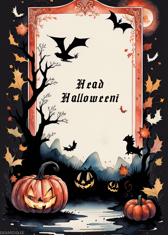 See on suurepärane Halloweeni kaart, mis on kaunistatud sügisese maastiku, nahkhiirte ja kõrvitsatega. Ideaalne kaart Halloweeni puhul sõpradele ja perele.