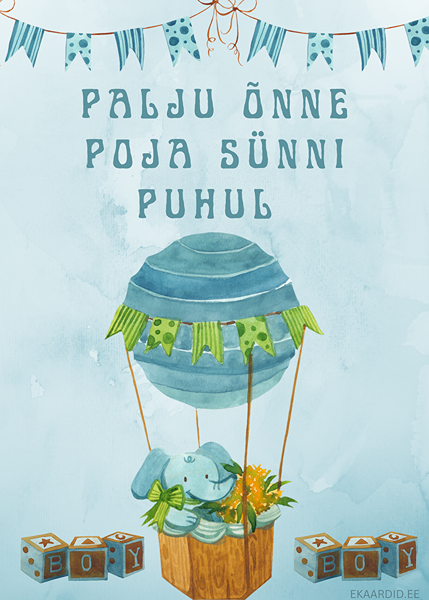 Õrn ja armas kaart poisi sünni puhul. Kaardi kujundus on inspireeritud õhupallist ja armsast elevantkesest. See on ideaalne tahtpäeva kaart.