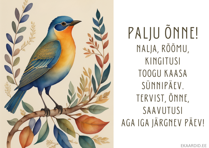 Soovi oma lähedastele ilusat sünnipäeva selle armsa sünnipäevakaardiga. Kaardil on kujutatud ilus värviline lind ja soovid.