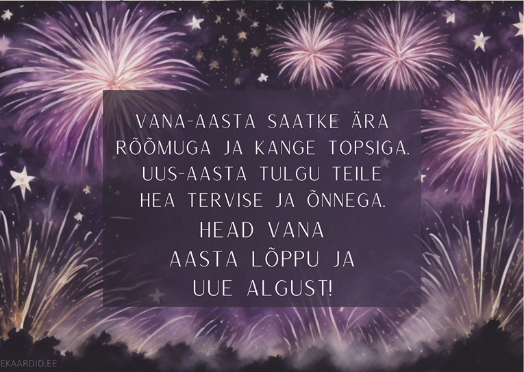 Soovi oma lähedastele head uut aastat selle kauni ilutulestikuga kaardiga. See on ideaalne tahtpaevad-aastavahetus kaart, mis toob rõõmu ja soojust.