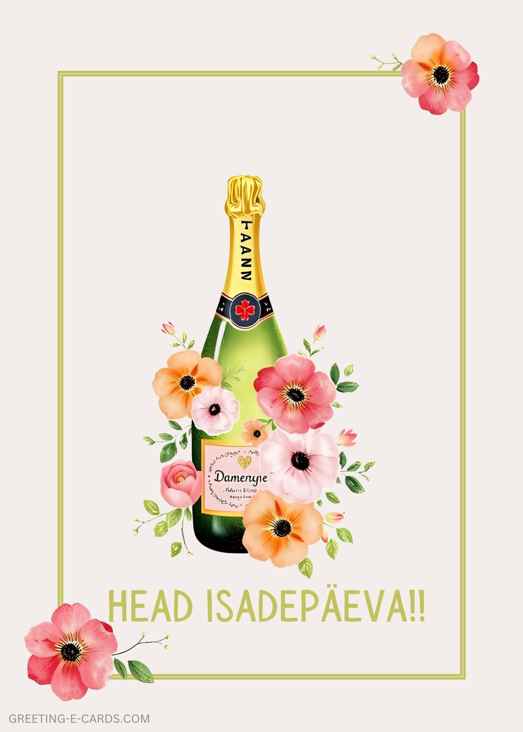 Soovi isale head Isadepäeva selle elegantse kaardiga, millel on kujutatud šampanjapudeli ja värviliste lillede kompositsioon. See on ideaalne Isadepäevakaart, mis väljendab armastust ja lugupidamist.