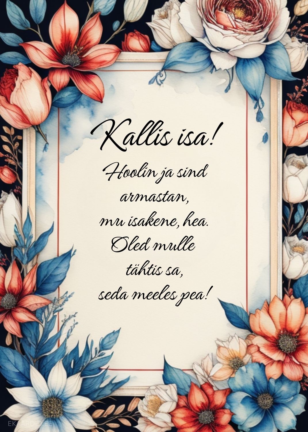 Ilus Isadepäevakaart, mis on kaunistatud siniste ja punaste lilledega. Ideaalne kingitus isale, et näidata oma armastust ja hoolimist.