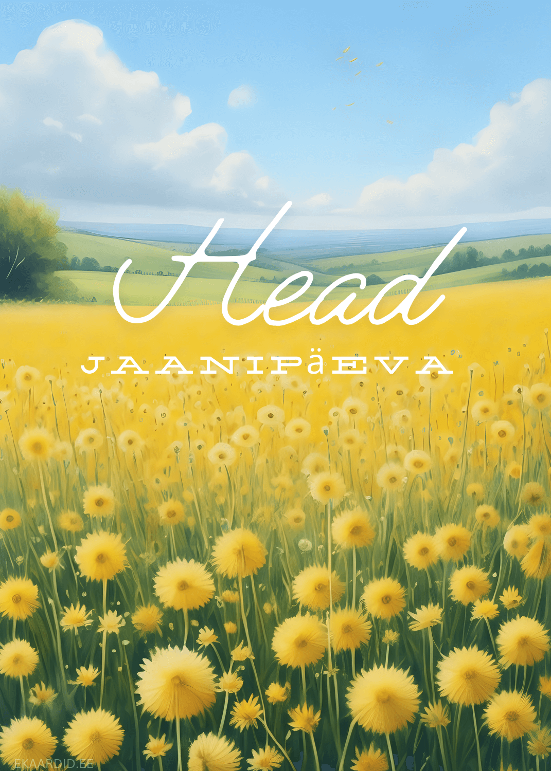 Soovi oma lähedastele head Jaanipäeva selle kauni ja sooja õhkkonnaga kaardiga, mis on kaunistatud kollaste lilledega. See on ideaalne Jaanipäeva kaart.