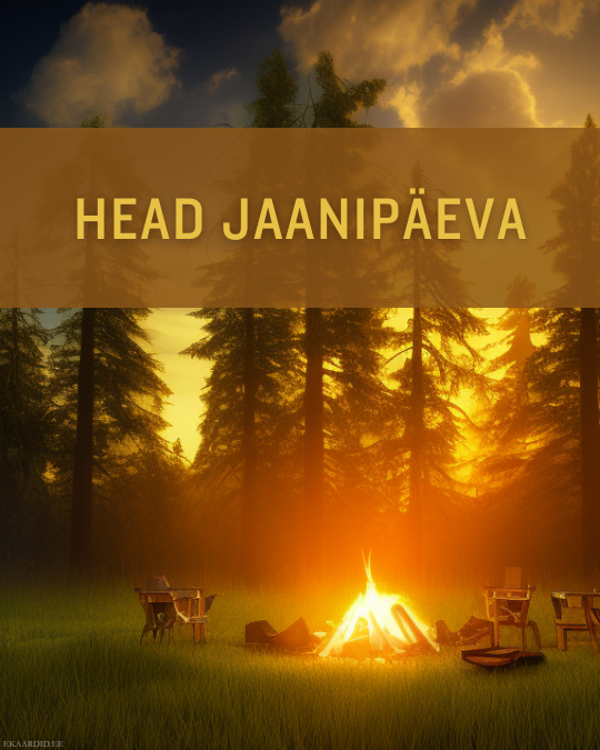 Soovi oma lähedastele head Jaanipäeva selle sooja ja hubase õnnitluskaardiga. Kaardil on kujutatud romantiline lõkkeõhtu metsas. See on ideaalne Jaanipäeva kaart.