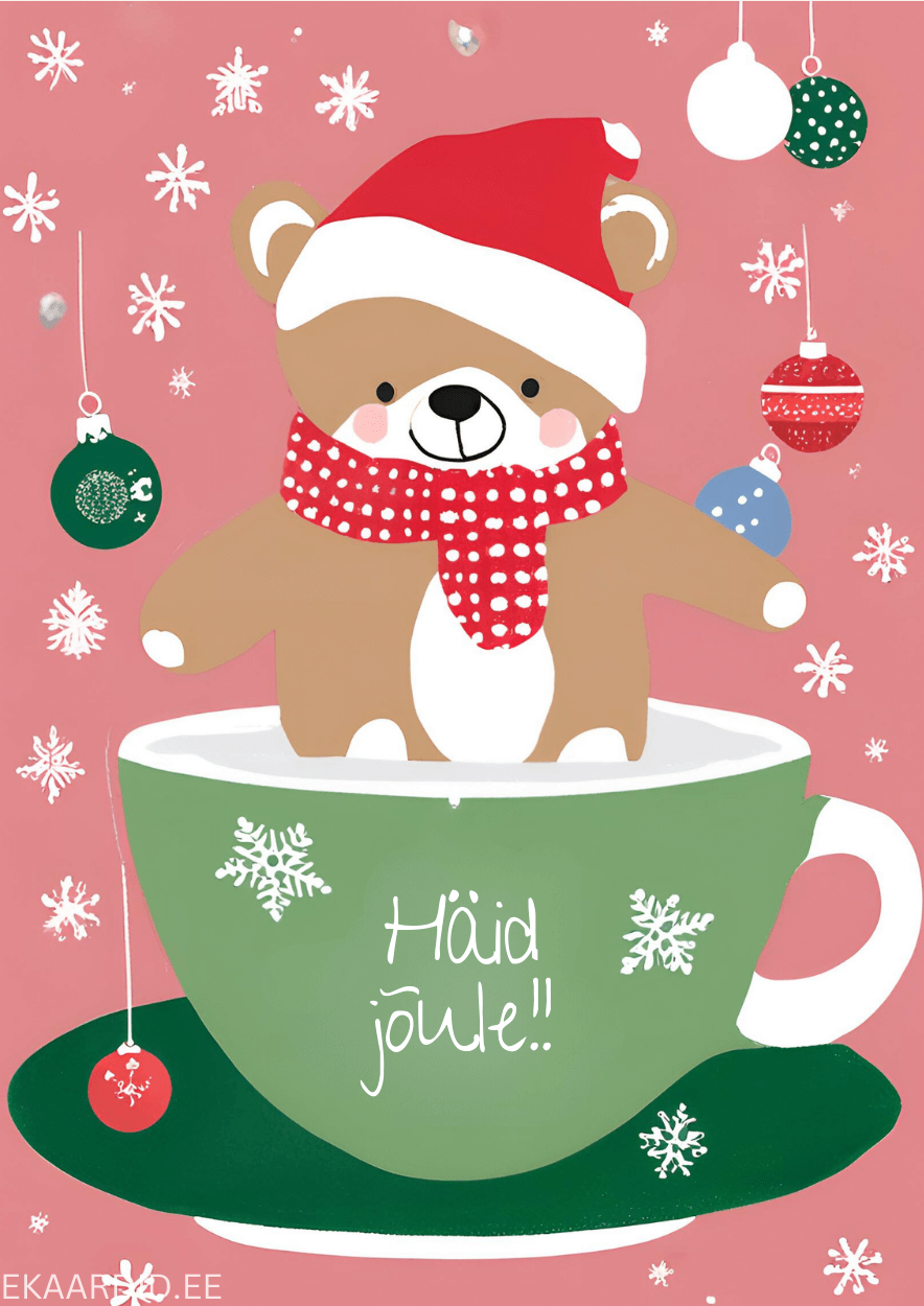 Sooja ja hubast jõulutunnet pakkuv jõulukaart, millel armas karu istub rohelises joogitassi sees. Ideaalne jõulukingitus lähedastele!