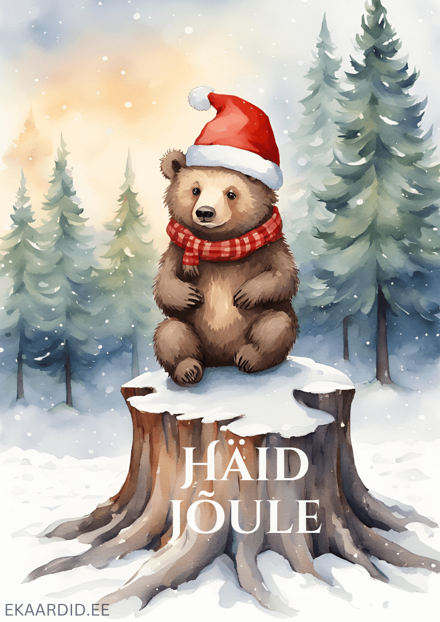 Sooja ja hubast jõulutunnet edastav jõulukaart. Kaardil on armas karupoeg, kes istub lumega kaetud kändul talvemetsas. See on ideaalne jõulukaart lähedastele.