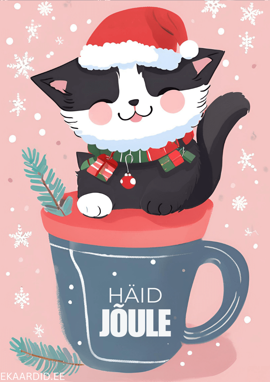 Sooja ja hubast jõulutunnet pakkuv kaart armasaga jõulukass, kes istub soojas kruusis. See on ideaalne jõulukaardiks lähedastele ja sõpradele.