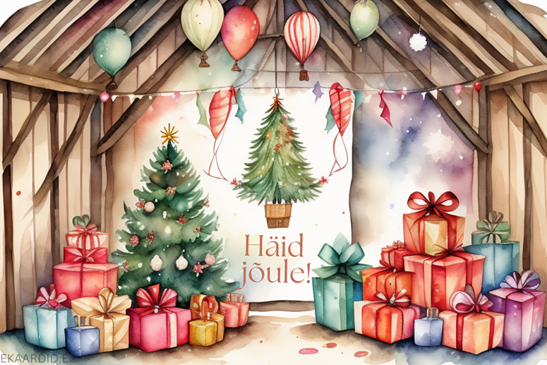 Sooja ja pidulikku jõulutunnet edastav kaart, mis on kaunistatud õhupallide ja kingitustega. See on ideaalne jõulukaardid.