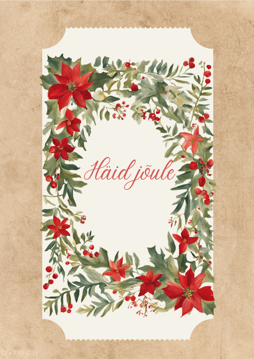 Sooja ja pidulikku jõulutunnet täis kaart, mis on kaunistatud punaste jõulutähtede ja marjadega. See on ideaalne jõulukaardina lähedastele ja sõpradele.