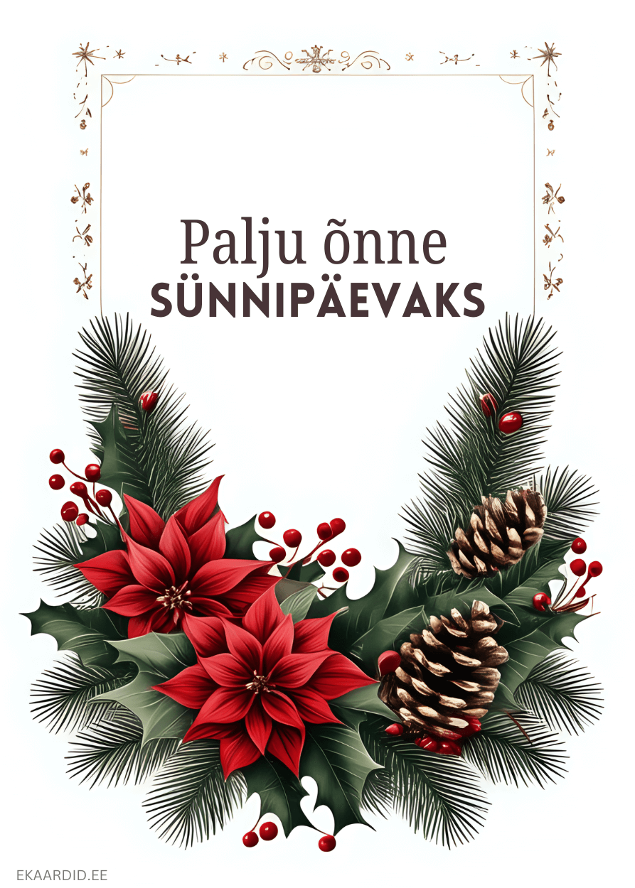 See on suurepärane jõuluteemaline sünnipäevakaart, mis on kaunistatud okaspuuokste ning käbidega. Saada see sooja ja südamliku tervitusega oma lähedasele.