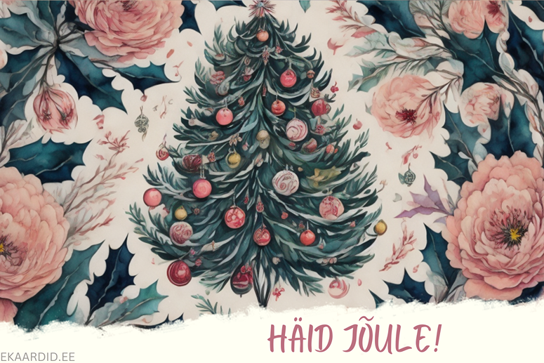 Soovi oma lähedastele rõõmsaid jõule selle kauni jõulukaardiga, mis on kaunistatud roosade lilledega ja piduliku jõulupuuga. Ideaalne jõulukingitus!
