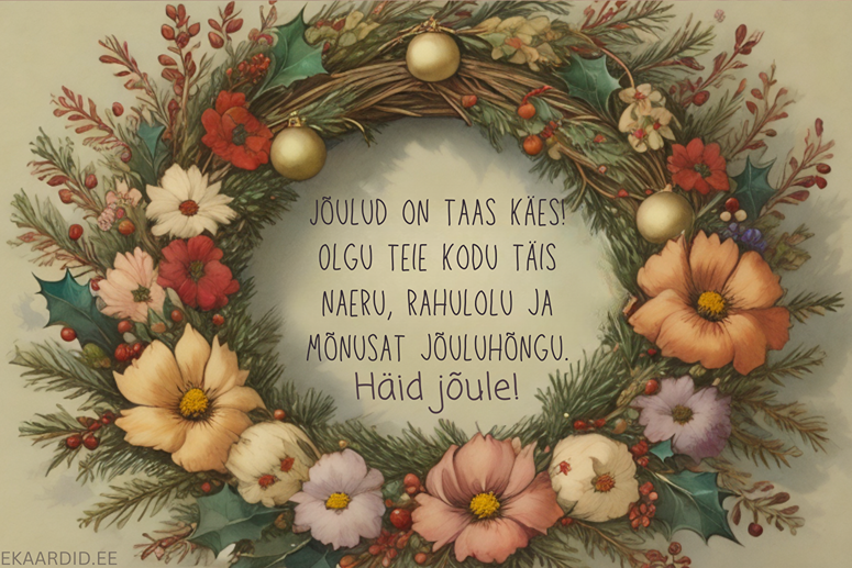 Soovi oma lähedastele rõõmsaid jõule selle kauni jõulukrooniga kaardiga. See on ideaalne jõulukaart, mis toob sooja ja hubast jõulutunnet.