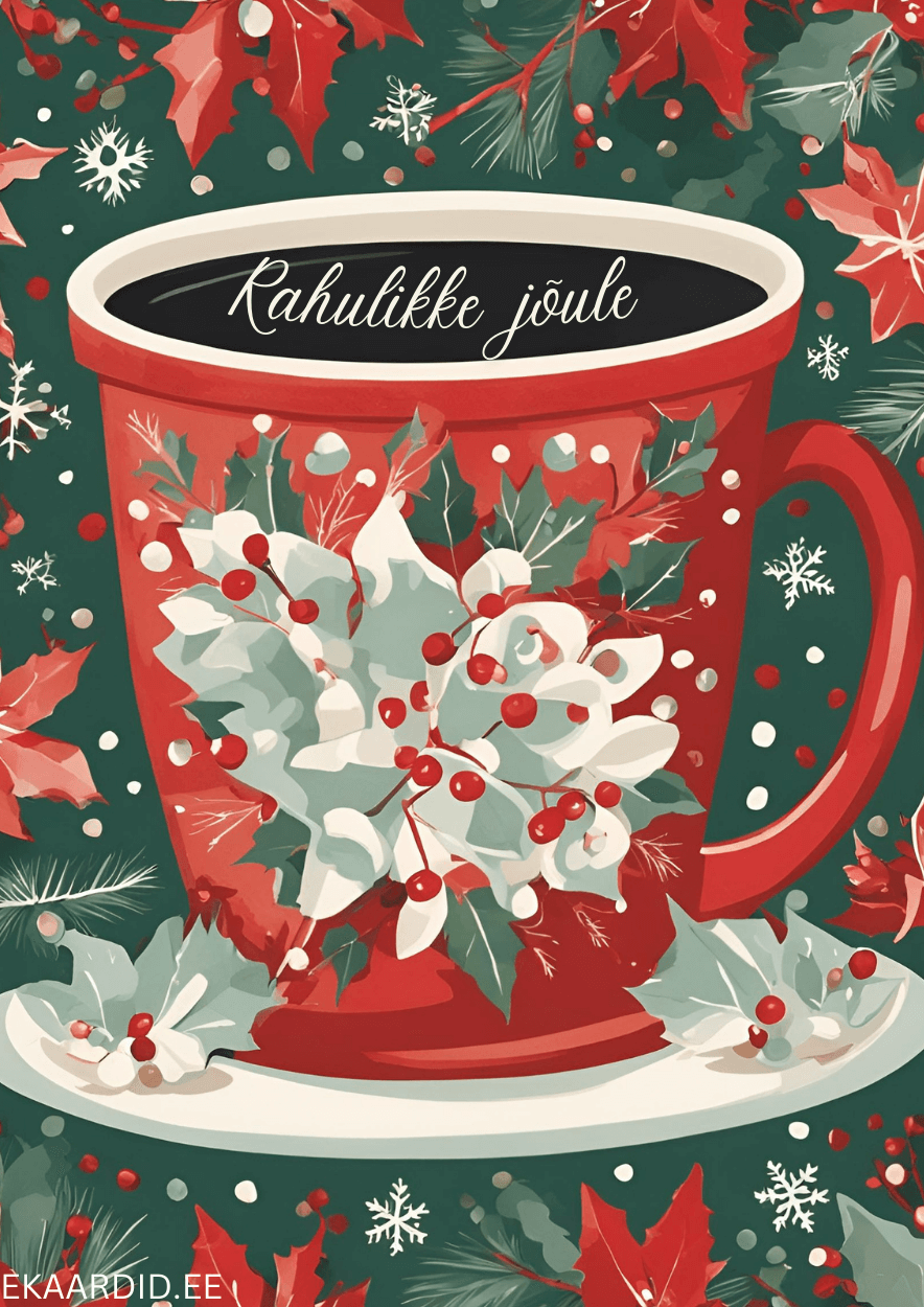 Sooja ja hubast jõulutunnet edastav jõulukaart. Punase joogikruusi kujundus lisab kaardile pidulikkust. See on ideaalne jõulukaart lähedastele ja sõpradele.