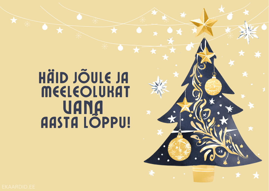 Soovi oma lähedastele rõõmsaid jõule ja head uut aastat selle kauni jõulukaardiga. Kaardil on kujutatud elegantne tume-sinine jõulupuu kuldsete kaunistustega. See on ideaalne jõulukaart lähedastele ja sõpradele.