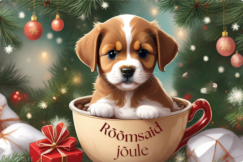 See armas jõulukaardi kujundus toob teie lähedastele naeratuse näole. Kutsikas kohvitassis annab sooja ja hubast jõulutunnet. Ideaalne jõulukaardiks lähedastele ja sõpradele.