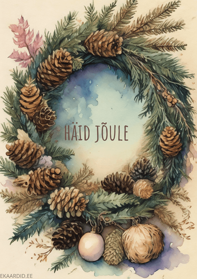 Soojad jõulusoovid lähedastele! See kaart on kaunistatud männiokkadest ja käbidest valmistatud pärjaga. Ideaalne jõulukaart perele ja sõpradele.