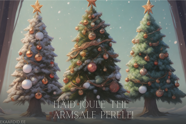 Soojad ja südamlikud jõulusoovid teie armsale perele. See jõulukaart on kaunistatud lumiste kuuskede ja kuldsete ehetega.