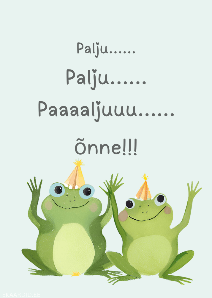 Naljakas ja armas sünnipäevakaart kahe konnaga, kes soovivad sünnipäevalapsele palju õnne. Saada see humoorikas sünnipäevakaart sõbrale, pereliikmele või kolleegile! Ideaalne valik sunnipaeva-huumori austajatele.