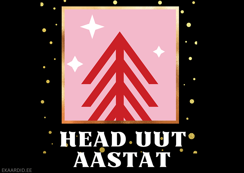 Soovi oma lähedastele head uut aastat selle elegantse kaardiga. Kaardil on kujutatud stiliseeritud jõulupuu roosal taustal ja kuldsete konfeti elementidega. See on ideaalne aastavahetuse kaart.