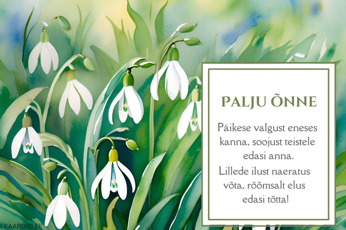 Ilus kevadine õnnesoovikaart, mis sobib erinevateks sündmusteks. Kaardil on kujutatud lumikellukesi ja soovid on kirjutatud kaardile. Sobib ideaalselt kingituseks!