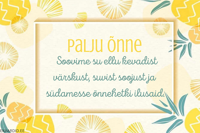 Ilus ja soe kevadine õnnitluskaart, mis soovib värskust, soojust ja õnnehetki. Ideaalne sünnipäevakaardina.
