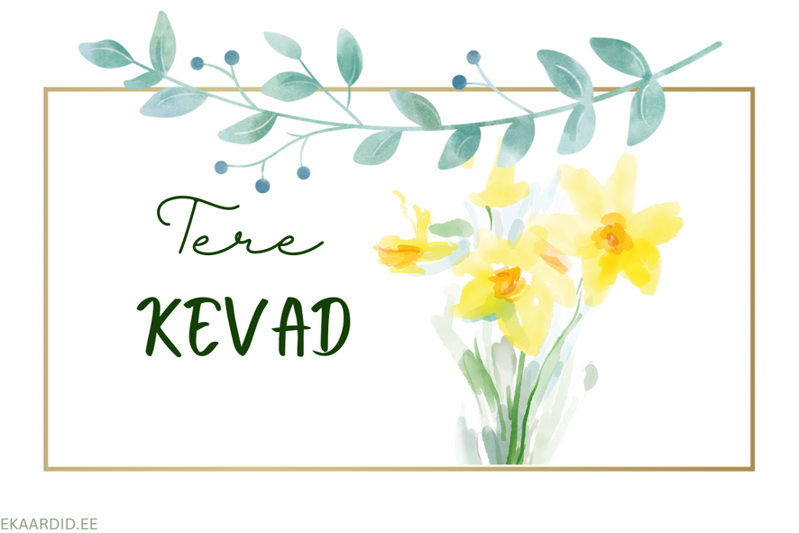 Sooja ja päikeselist kevadtervitust! See kaart on kaunistatud kollaste nartsisside ja roheliste okstega. Ideaalne kevadine tervituskaart.