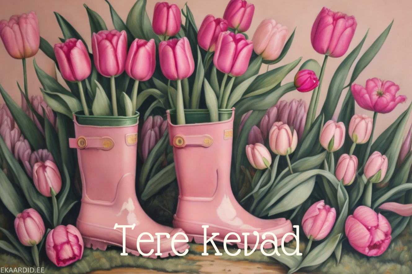 See on armas kevadine kaart, mis kujutab roosat tulbikimpu roosades kummikutes. Ideaalne kaart kevadiste soovide saatmiseks.