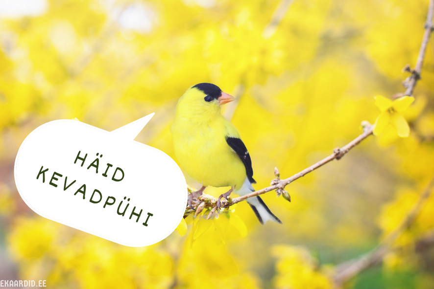 Soovi oma lähedastele ilusat kevadpüha selle rõõmsa ja värvika kaardiga. Kaardil on kujutatud kollane lind õitsevate kollaste lillede seas. See on ideaalne kevadpüha kaart.