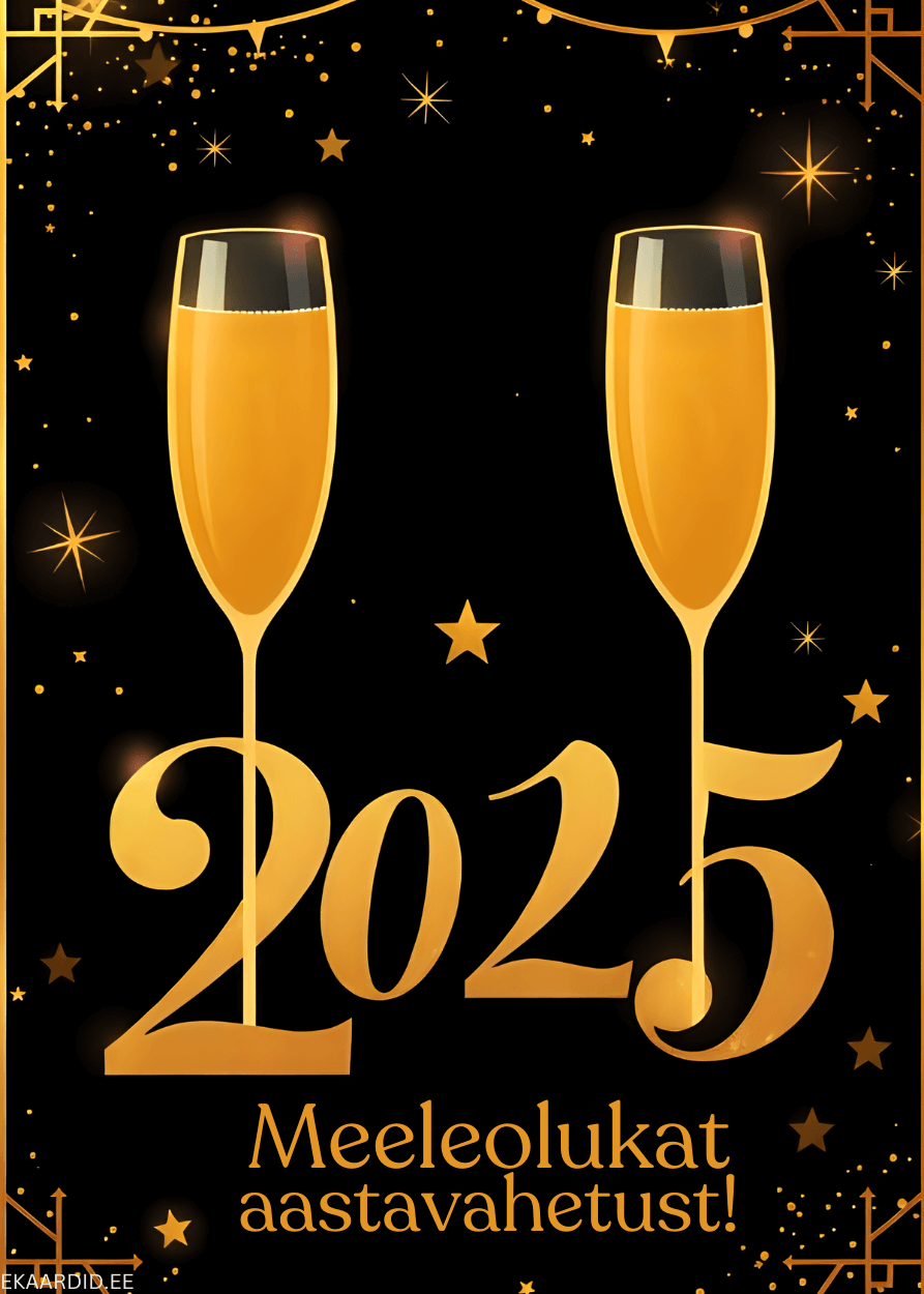 Soovi oma lähedastele rõõmsat uut aastat selle elegantse aastavahetuse kaardiga. Kaardil on kujutatud kaks kuldset šampanjaklaasi, mis sümboliseerivad pidulikku meeleolu. Ideaalne kaart aastavahetuse tervituseks.