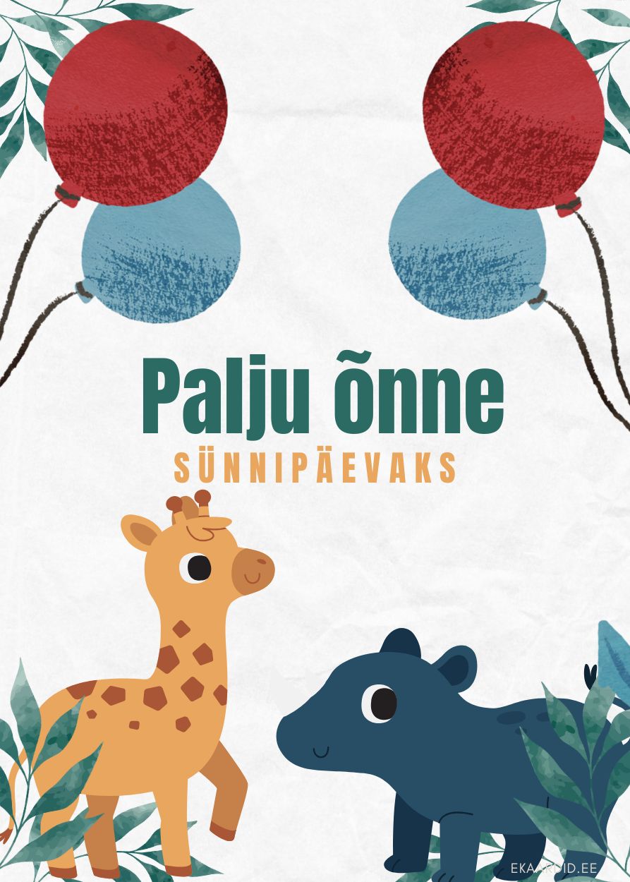 Laste sünnipäevakaart kaelkirjakute ja tapiiridega