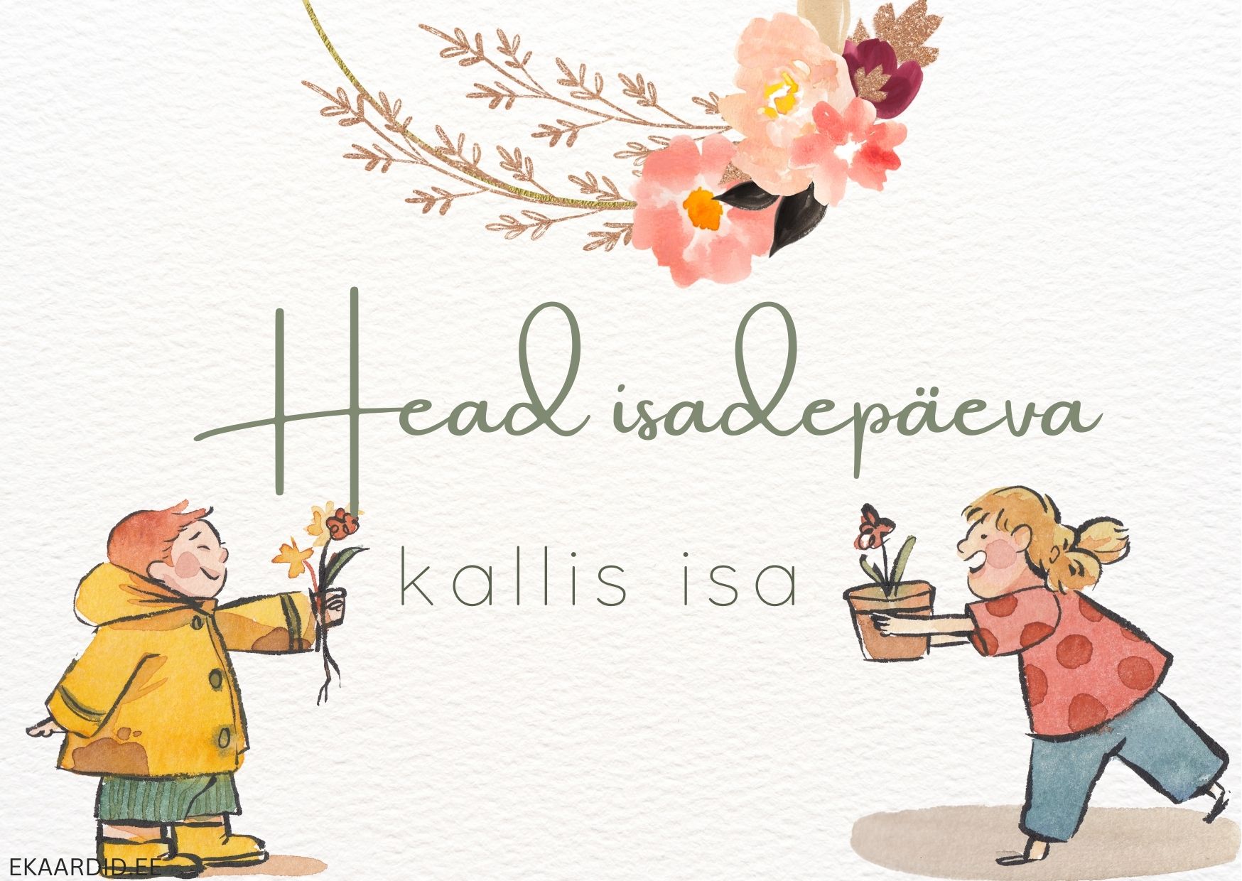 Soovi isale head Isadepäeva selle armsa kaardiga, kus lapsed annavad isale lilled ja taime. See on ideaalne Isadepäevakaart.