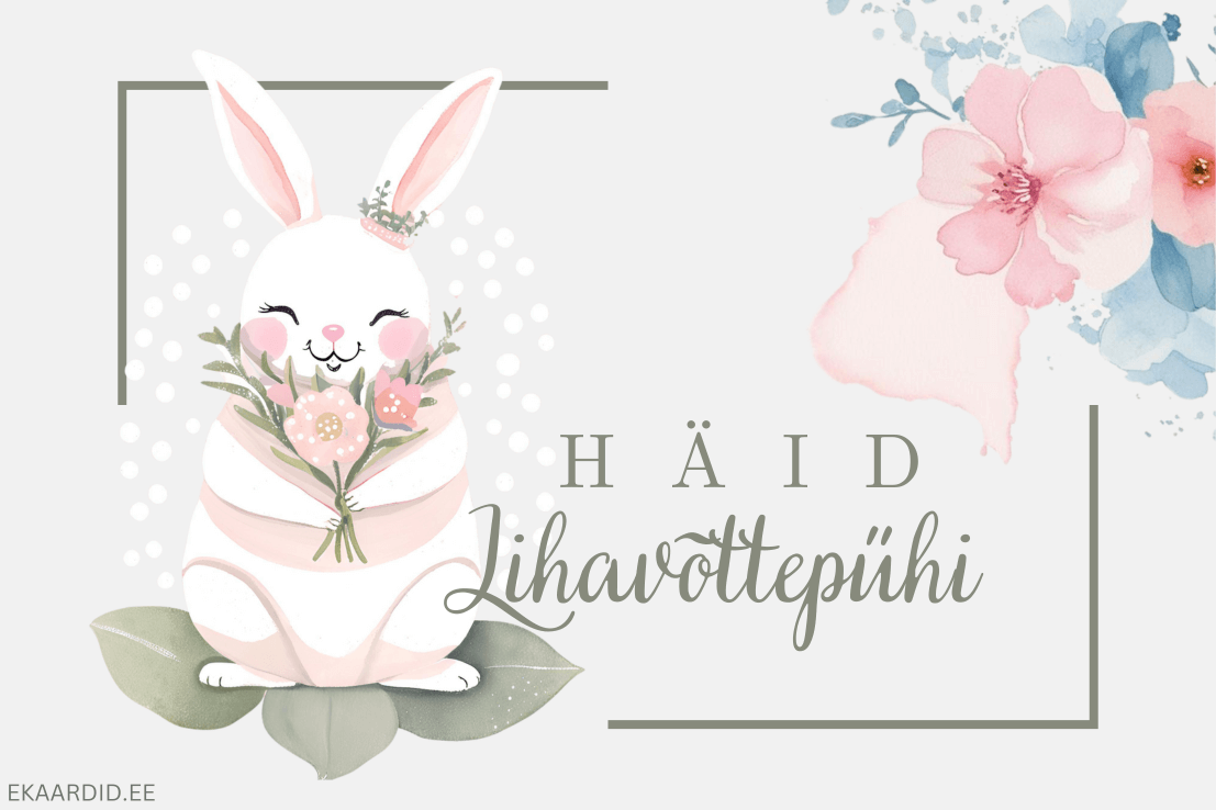 Sooja ja õrna disainiga lihavõttekaart, millel on armas jänes lilledega. See on ideaalne lihavõttekaart sõpradele ja perele.