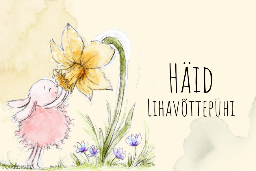 Sooja ja õrna meeleoluga lihavõttekaart, millel armas jänes nuusutab nartsissi. Ideaalne lihavõttepühade tervituseks.