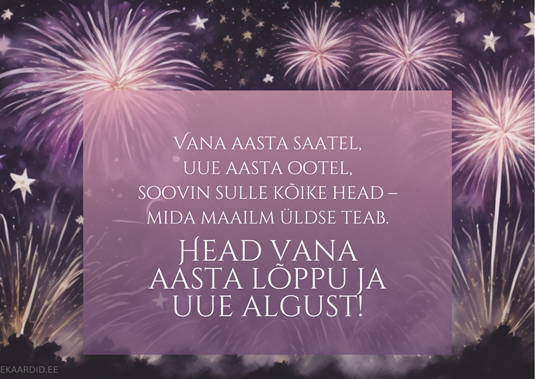 Soovi lähedastele head uut aastat selle kauni, lillade ilutulestikega kaardiga. See on ideaalne uusaasta kaart, mis toob kaasa soojad ja rõõmsad tunded.