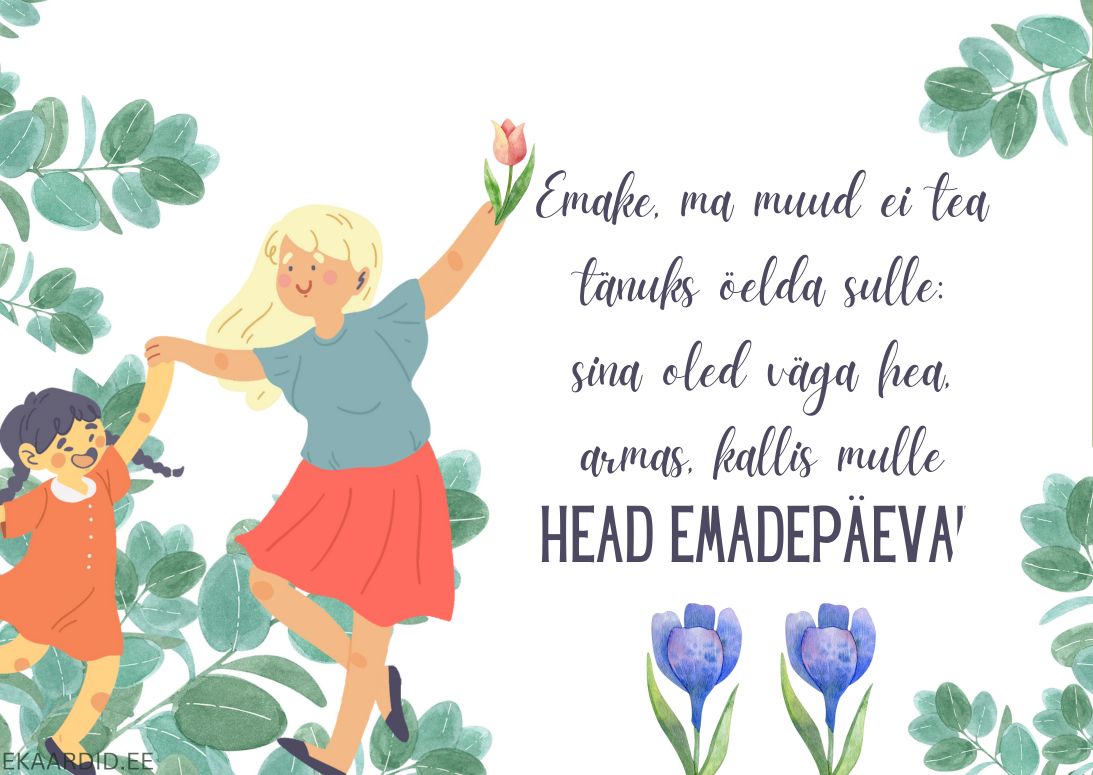 Soovi oma emale ilusat emadepäeva selle armsa kaardiga, mis on kaunistatud lilledega ja kujutusega tantsivast emast ja tütrest. See on ideaalne tahtpaevad-emadepaev kaart, mis väljendab armastust ja tänu.