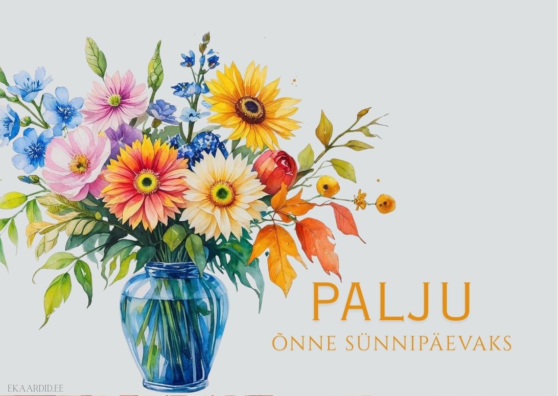See on suurepärane sünnipäevakaart, mis on kaunistatud värviliste lillede ja sügislehtedega. Saada see oma lähedasele ja soovi talle palju õnne!