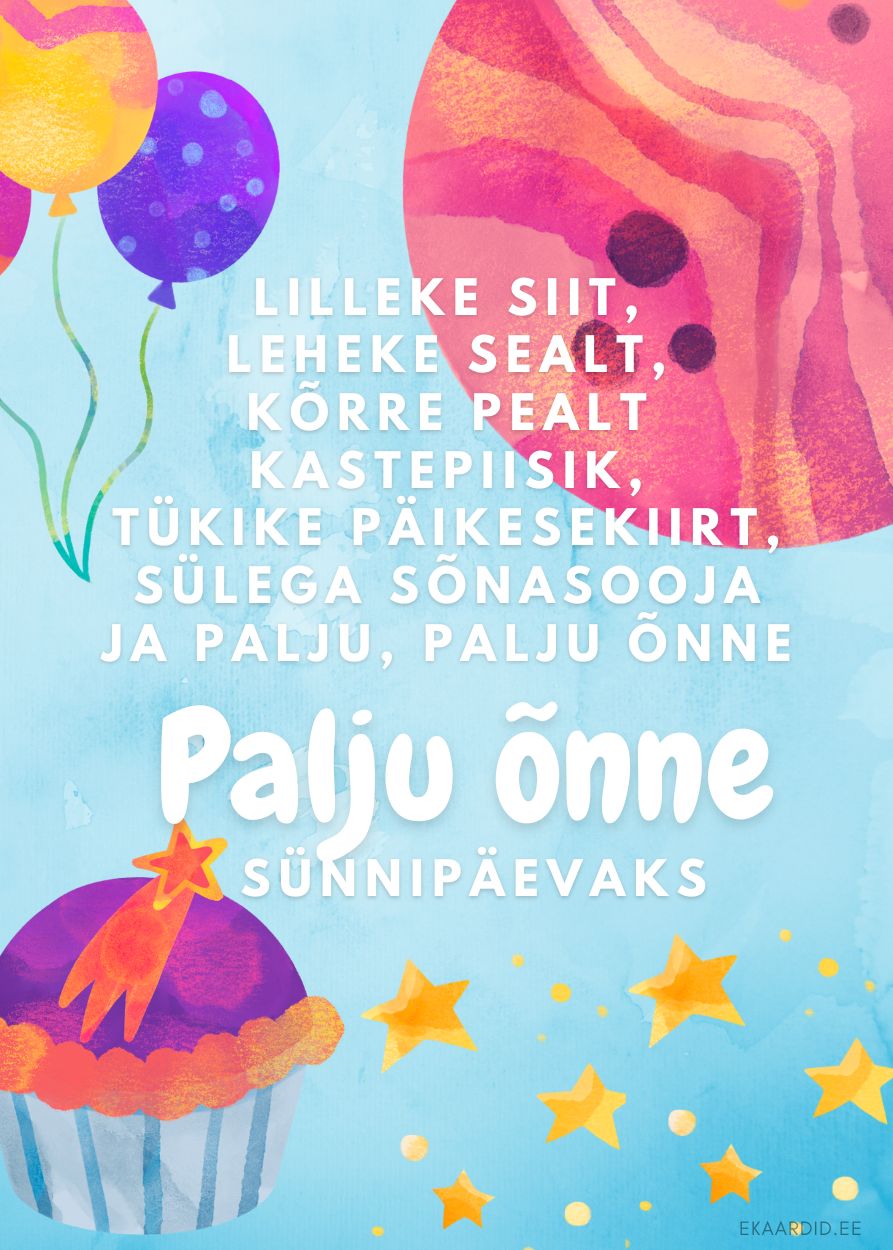 See on rõõmsameelne ja värvikas sünnipäevakaart, mis on kaunistatud lillede, tähtede ja õhupallidega. Ideaalne kingitus sõbrale või pereliikmele, kes armastab positiivset energiat.