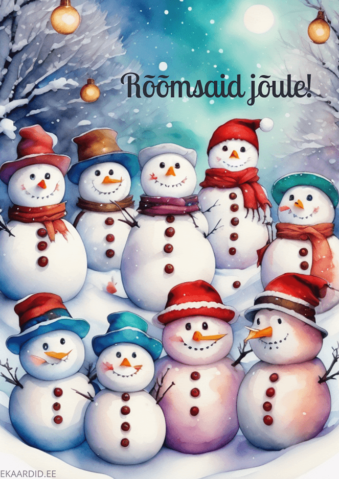 Soojad jõulusoovid armsate lumememmedega kaunistatud jõulukaardil. Ideaalne kaart lähedastele ja sõpradele.