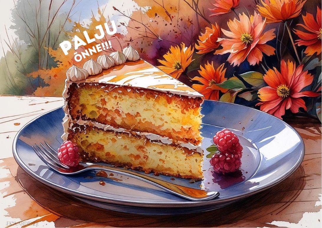 See on suurepärane sünnipäevakaart, millel on kujutatud isuäratav kook ja värvilised lilled. Saada see kaart oma lähedasele ja soovi talle palju õnne!