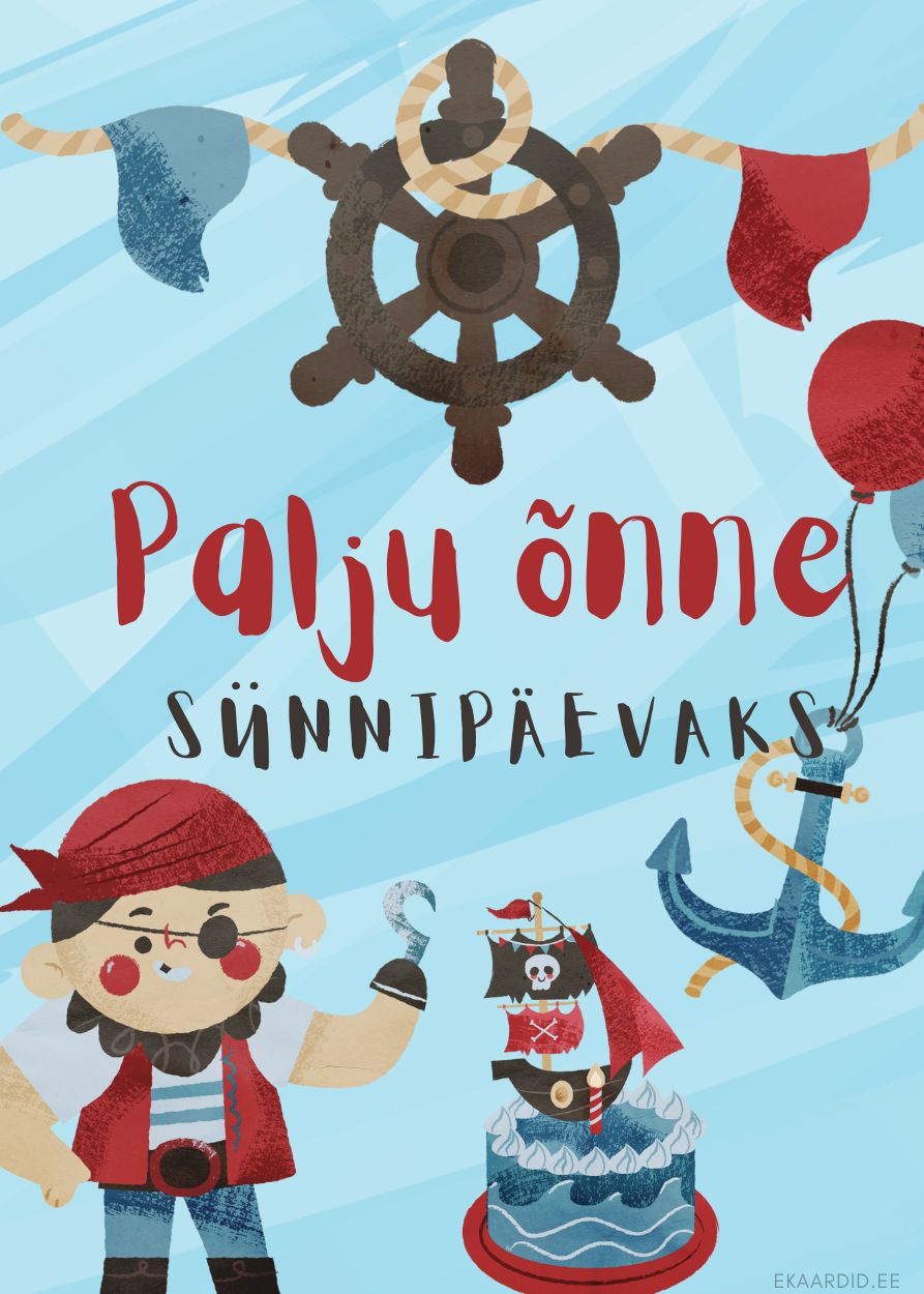 See on suurepärane sünnipäevakaart poisile, kellele meeldivad piraadid ja mere seiklused. Kaardil on pildil armas piraat, laev ja sünnipäevakook.