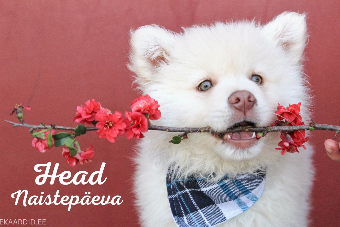 Soovi oma lähedastele naistele ilusat naistepäeva selle armsa kutsika ja õitega kaardiga. See on ideaalne Naistepäevakaart, mis toob naeratuse näole.