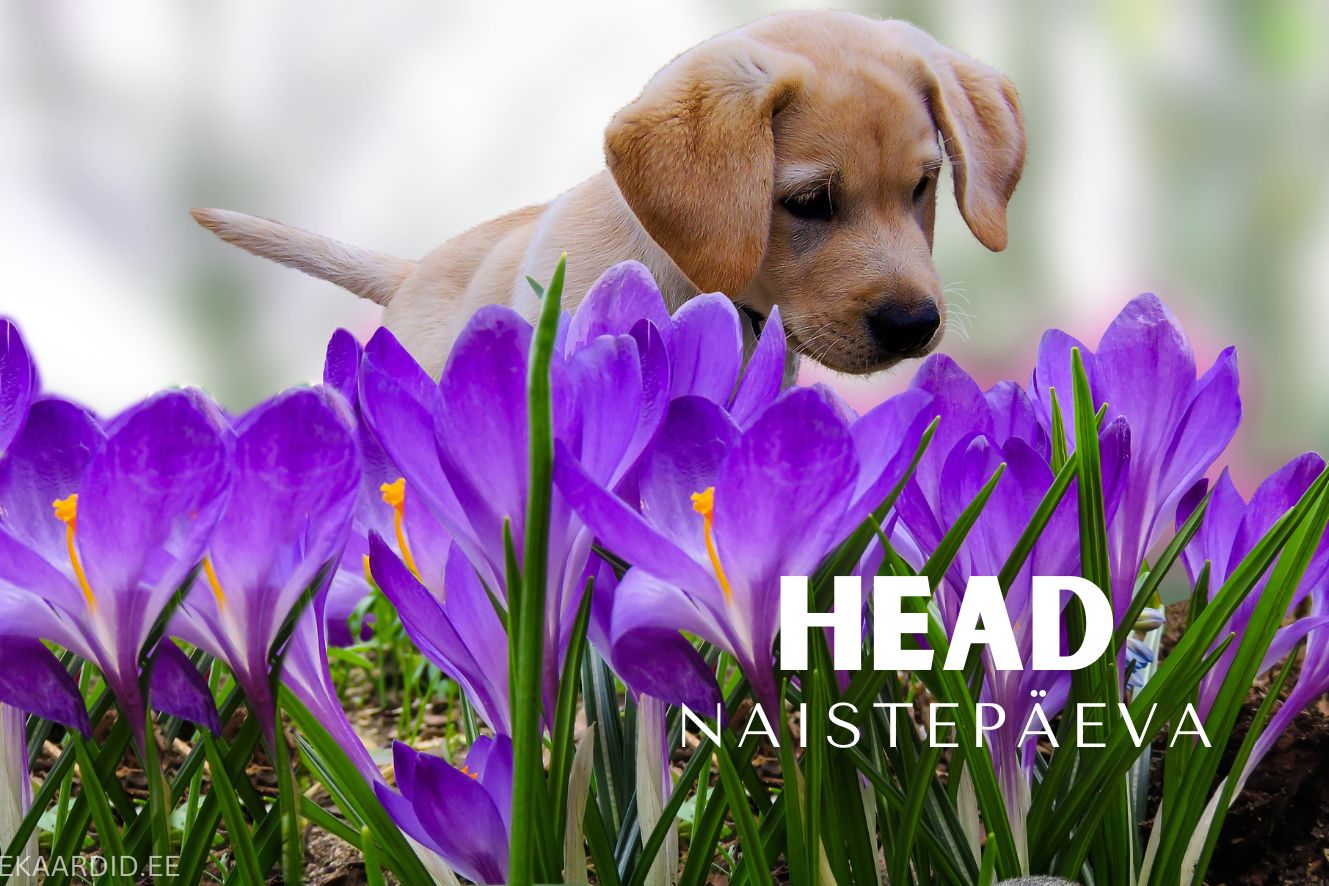 Naistepäeva kaart koerakutsikaga ja krokustega