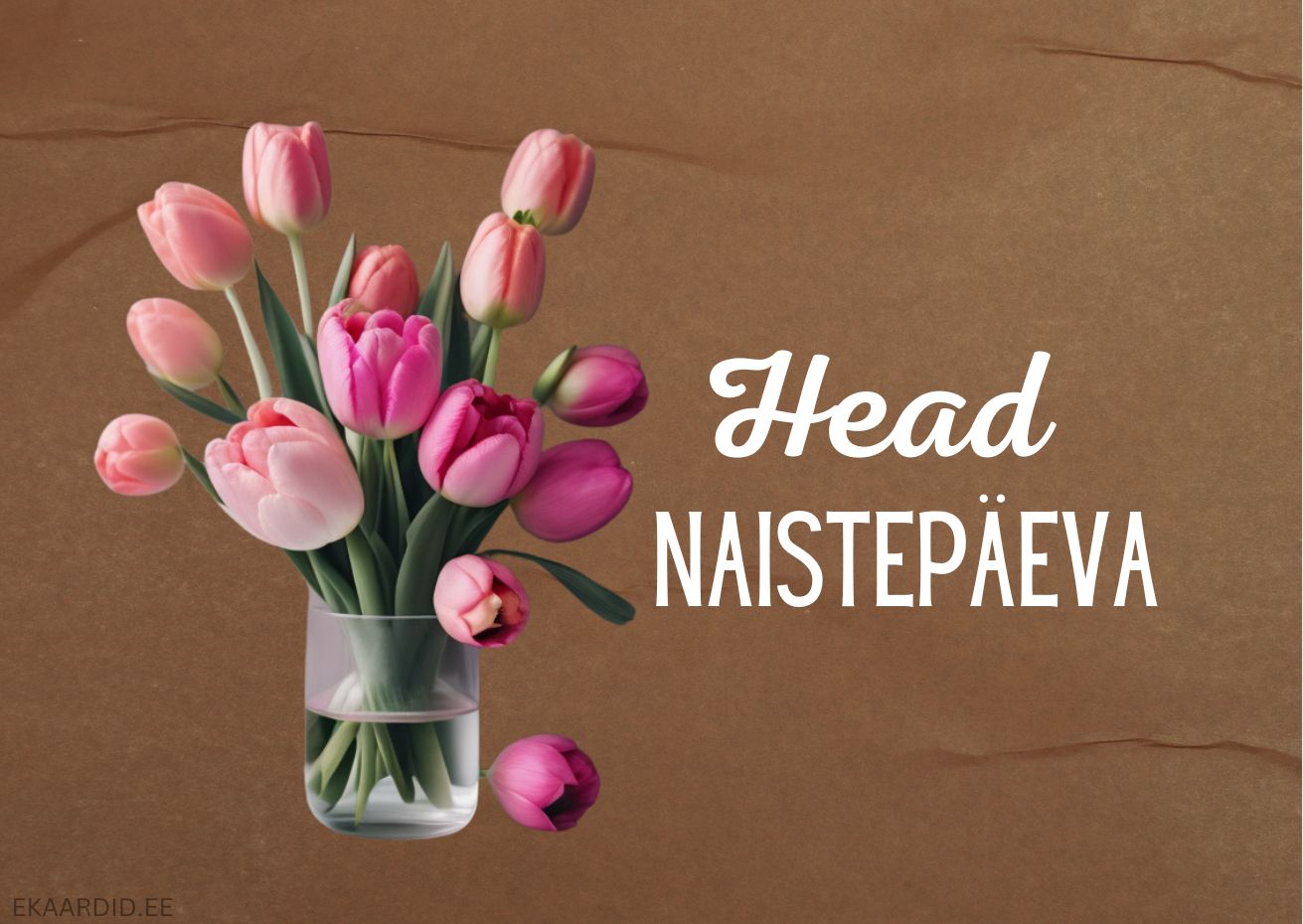 Soovi oma lähedasele naistepäeva puhul palju õnne selle kaardiga, mis on kaunistatud roosade ja valgete tulpidega. See on ideaalne Naistepäevakaart, mis väljendab teie hoolt ja armastust.