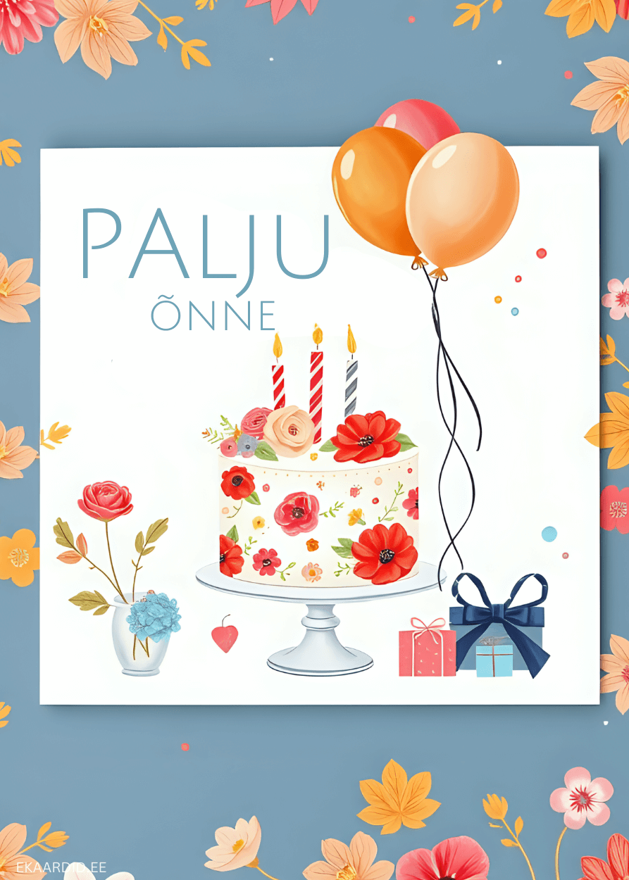 See on suurepärane sünnipäevakaart, mis on kaunistatud värviliste lillede ja piduliku tordiga. Soovi oma lähedasele palju õnne selle rõõmsa kaardiga!