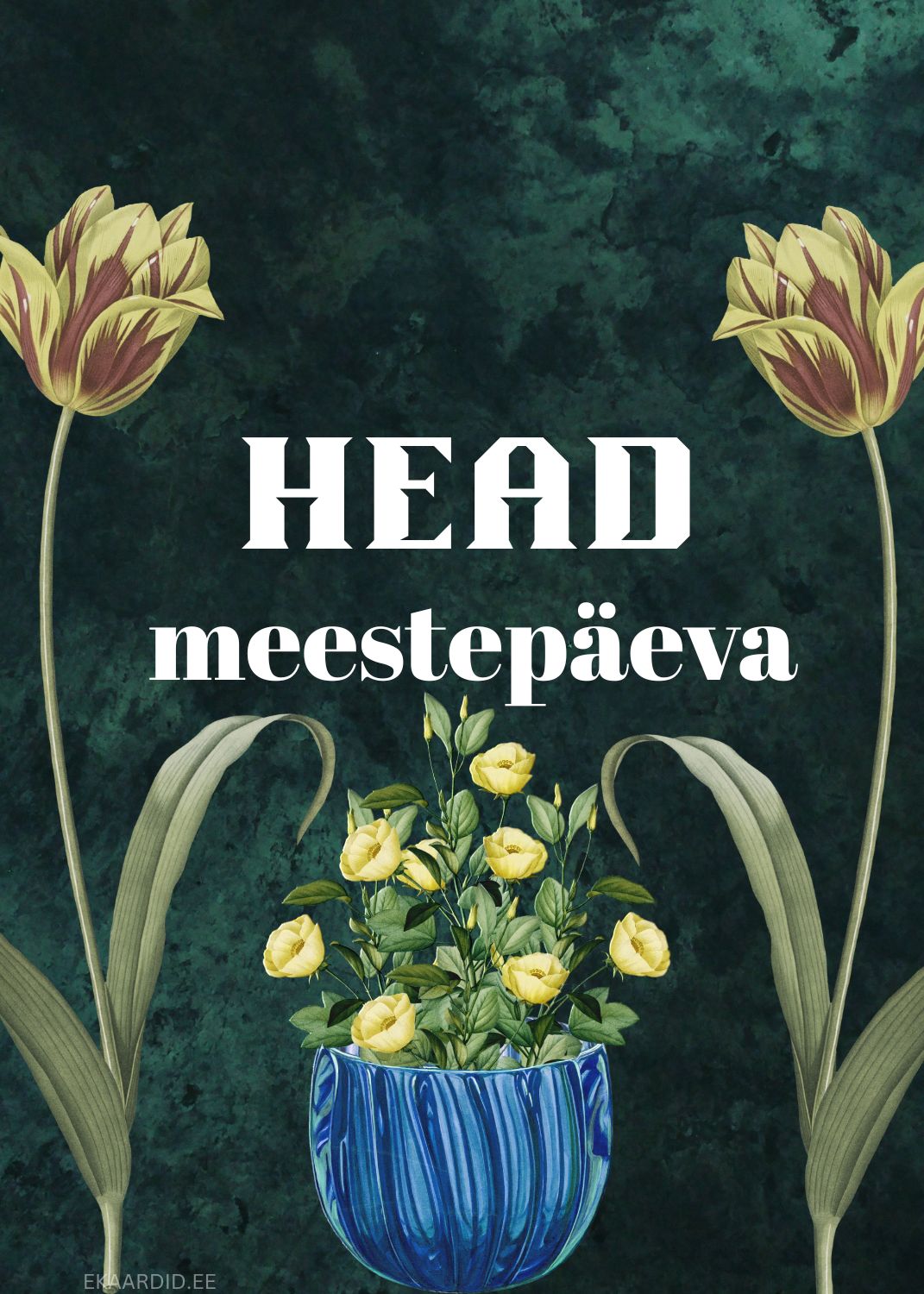 Soovi oma isale, vennale või sõbrale ilusat Meestepäeva selle elegantse kaardiga. Kaart on kaunistatud kaunite tulbide ja kollaste lilledega sinises vaasis. See on ideaalne Meestepäeva kaart.