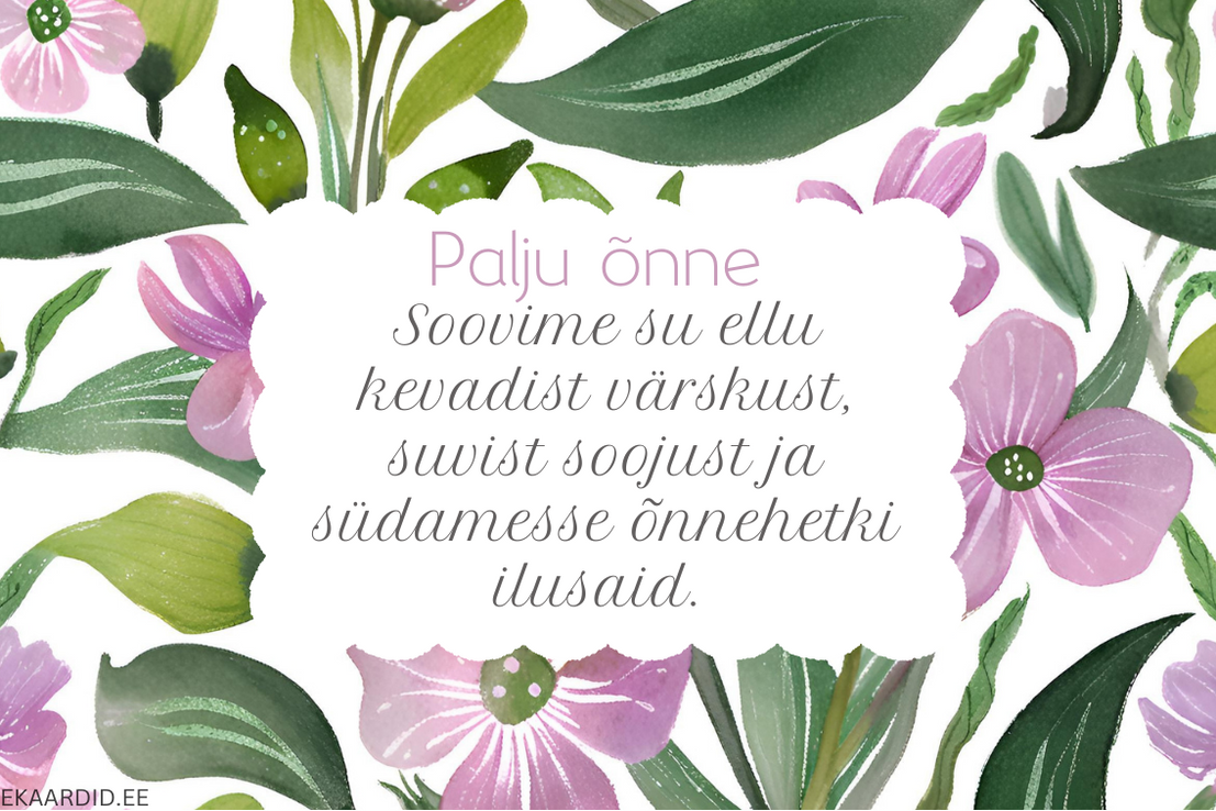 Ilus õnnitluskaart, mis soovib kevadist värskust, suvist soojust ja südamesse õnnehetki. Ideaalne sünnipäevakaart.