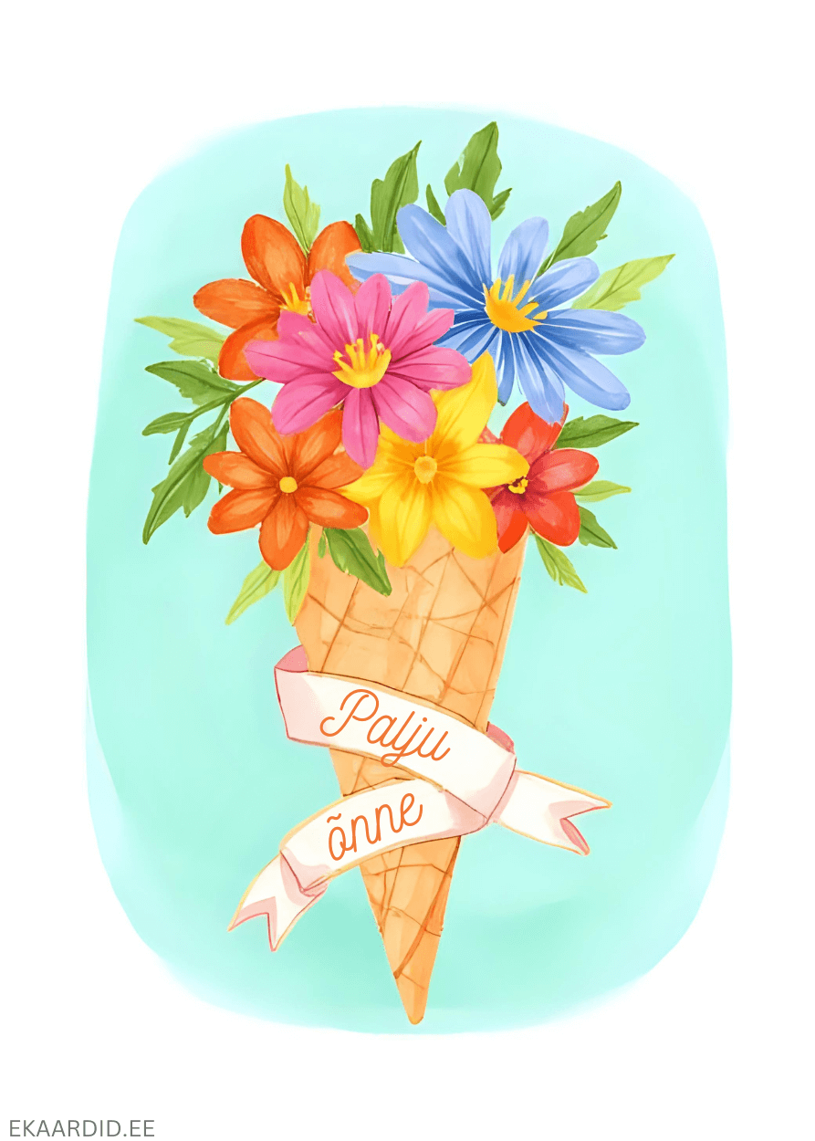 Ilus ja õrn sünnipäevakaart, mis on täis värvikaid lilli jäätisetopsis. Soovi oma lähedastele palju õnne selle armsa sünnipäevakaardiga!