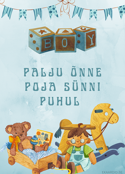 Soovi oma lähedastele palju õnne selle armsa ja südamliku kaardiga poja sünni puhul. Kaardil on kujutatud mänguasju ja armsaid detaile, mis teevad selle eriliseks.
