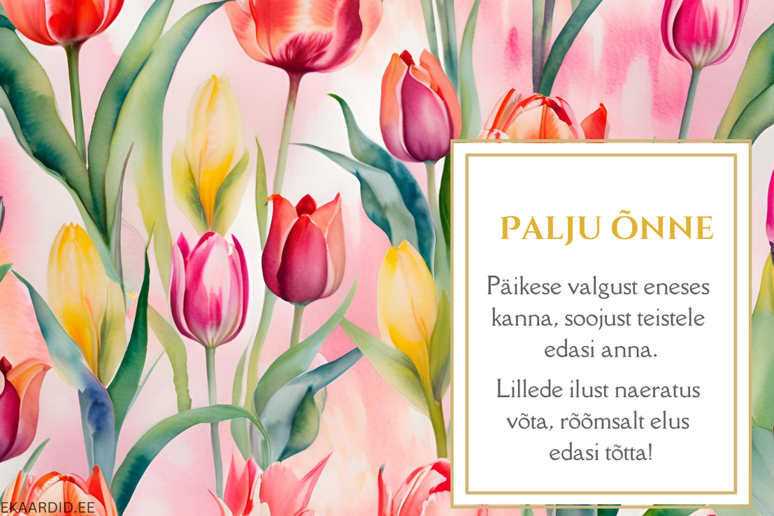 Ilus õnnitluskaart tulbidega, mis sobib suurepäraselt sünnipäeva puhul. Kaardi sees on ilus luuletus, mis soovib õnne ja rõõmu.