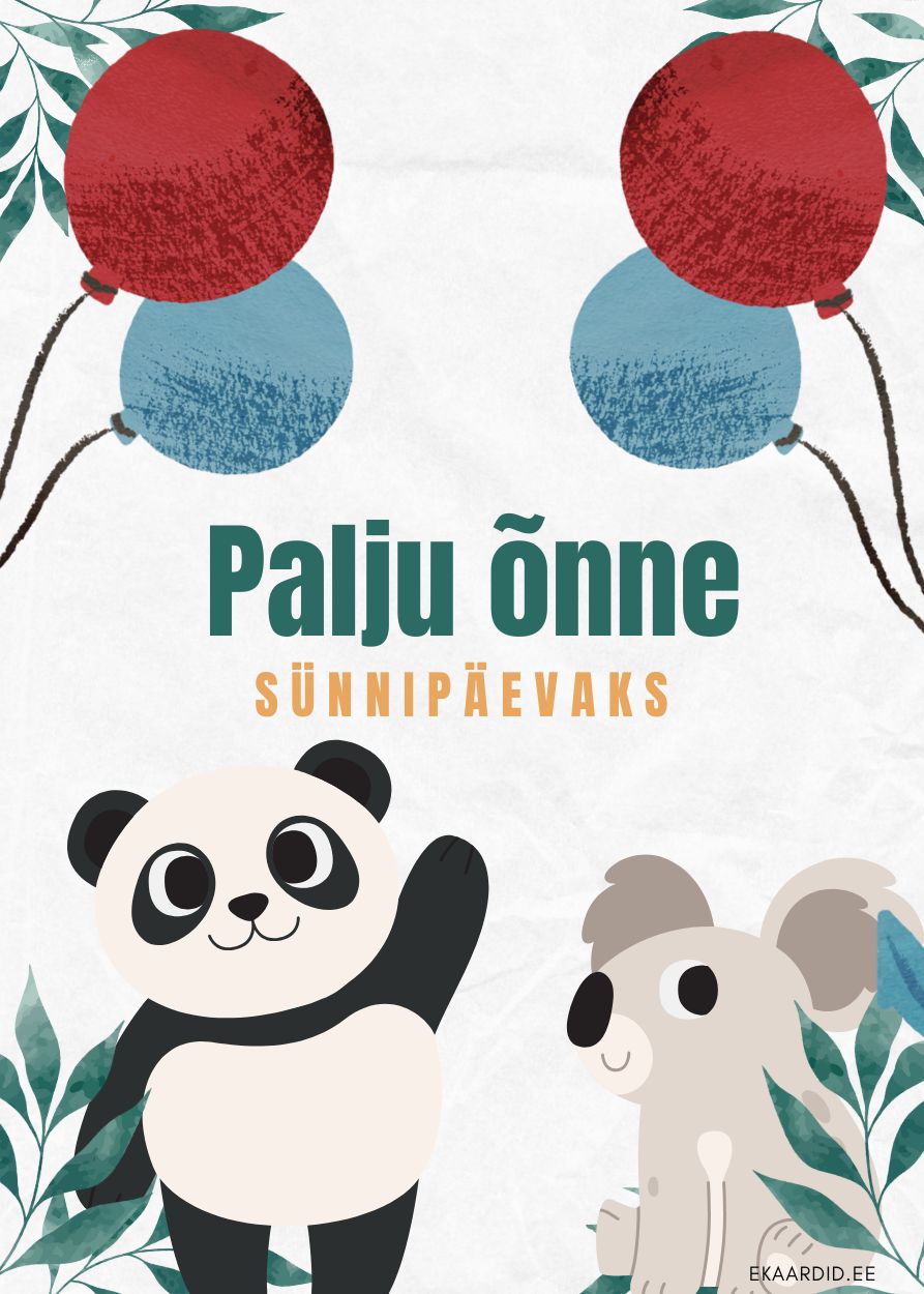 Soovi oma lähedasele palju õnne selle armsa panda ja koala kujutisega sünnipäevakaardiga. See on ideaalne sünnipäevakaart nii tüdrukule kui ka poisile.